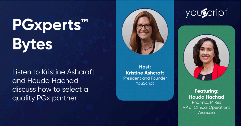 Host Kristine Ashcraft, President and Founder of YouScript, and Houda Hachad, Vice President of Clinical Operations at Aranscia, discuss how to select a quality PGx partner.